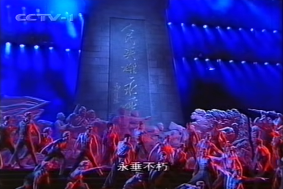 人民英雄紀(jì)念碑和演員們的V型站位