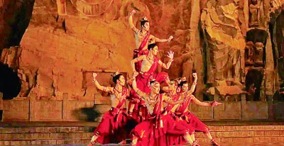 從中華優(yōu)秀傳統(tǒng)文化中尋找藝術基因和創(chuàng)作靈感的文藝佳作不斷涌現(xiàn),一部部舞臺表演藝術作品“破圈”而來,精彩紛呈。河南衛(wèi)視2021年七夕節(jié)制作的《七夕奇妙游》中以龍門石窟石刻圖像飛天和金剛為素材編創(chuàng)的實景舞蹈《龍門金剛》,就是其中的杰作之一。懷抱樂器的伎樂天從洞窟中飛出,在大佛的注視下翩翩起舞,金剛力士形象逼真、栩栩如生。藝術家賦予傳統(tǒng)文化遺存跨越歷史的藝術魅力。古風豫韻舞蹈藝術與龍門石窟悠久的歷史文化相得益彰,將“文化+旅游”的精髓和深意作了深刻的演繹和闡釋。