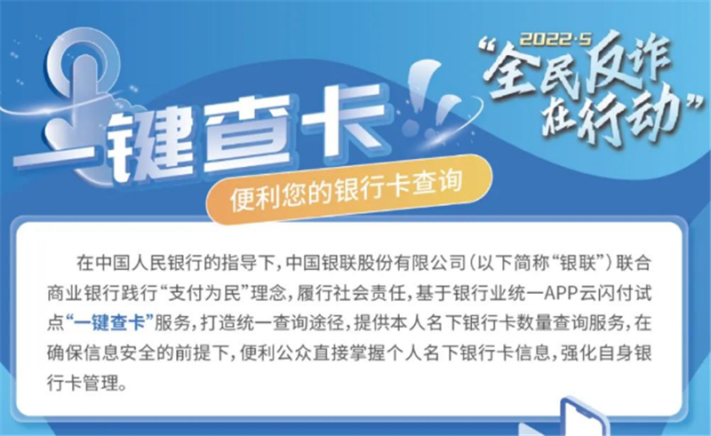 為解決群眾對于跨行銀行卡賬戶查詢的訴求,2021年12月,人民銀行指導(dǎo)中國銀聯(lián)股份有限公司聯(lián)合商業(yè)銀行基于銀行業(yè)統(tǒng)一APP云閃付試點“一鍵查卡”功能,打造統(tǒng)一查詢途徑,向公眾提供銀行卡數(shù)量、每張卡的銀行名稱、借貸記屬性、脫敏卡號等信息的查詢,在確保信息安全的前提下,便利公眾直接掌握個人名下銀行卡信息,強化自身銀行卡管理。