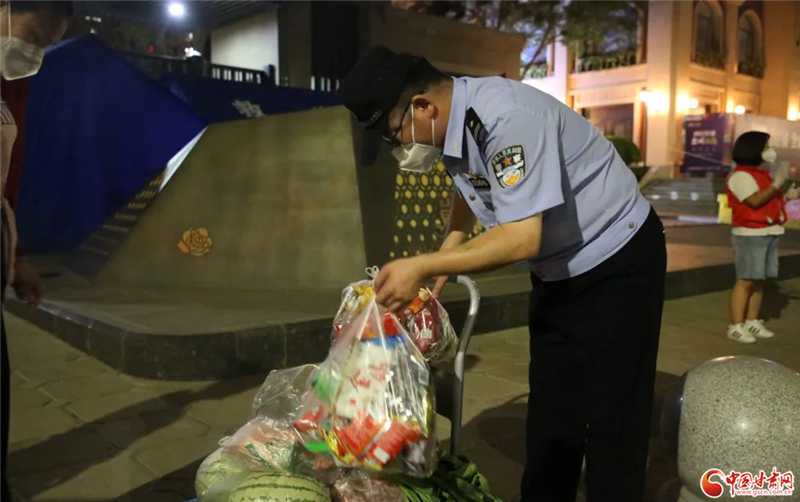 在安寧西路派出所轄區(qū)一處疫情高風(fēng)險小區(qū),李東輝擔(dān)負起了入口值守和物資轉(zhuǎn)運工作,每天值守至少12小時,實行“白+黑”24小時倒班模式。李東輝對群眾訂購的物資逐一進行核對登記,保證種類數(shù)量齊全,隨后進行消殺,再按照訂單先后順序轉(zhuǎn)運至小區(qū)門口。物資運送時時都有,李東輝總是從白天忙到深夜。