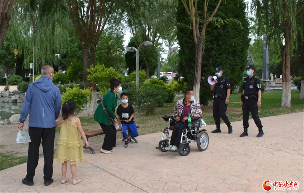 永登公安巡邏特警隊員在公園等公共場所手持小喇叭勸導(dǎo)群眾戴口罩少聚集不出門。永登縣局 徐大明/攝