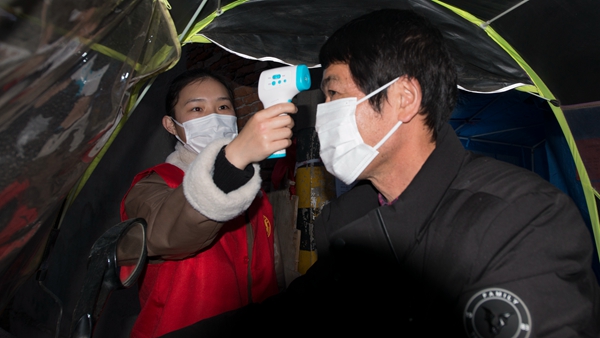 自疫情防控工作開展以來,湖北省咸寧市咸安區(qū)紀委監(jiān)委90后干部黃煬,始終堅守防疫一線,參與卡點值守、入戶摸排、生活物資代購等工作,耐心安撫居民情緒,為他們進行心理疏導(dǎo)。圖為黃煬為夜歸的居民測量體溫。(湖北省咸寧市咸安區(qū)紀委監(jiān)委 魯一凡 攝)