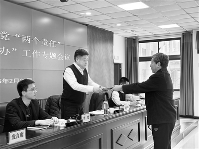 圖為河南省安陽(yáng)市紀(jì)委監(jiān)委向派駐市水利局紀(jì)檢監(jiān)察組遞交2025年度全面從嚴(yán)治黨監(jiān)督責(zé)任清單,持續(xù)推動(dòng)“兩個(gè)責(zé)任”走深走實(shí)。王小山 攝