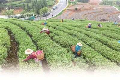 重慶市綦江區(qū)立足綠色生態(tài)資源稟賦,將茶產(chǎn)業(yè)打造成助力鄉(xiāng)村振興的主導產(chǎn)業(yè),讓“綠葉子”成為“金葉子”。圖為該區(qū)石角鎮(zhèn)新農(nóng)村村民在茶園內(nèi)采摘鮮茶葉。新華社發(fā)