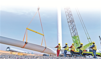 甘肅省高臺縣境內(nèi)有戈壁荒漠2000多平方公里,近年來憑借風光資源優(yōu)勢,發(fā)力新能源產(chǎn)業(yè)賽道。圖為該縣某新能源風力發(fā)電項目建設現(xiàn)場,工作人員正在安裝風力發(fā)電機。新華社發(fā)