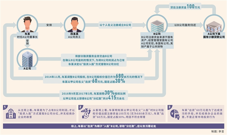 第二,車某的所謂出資行為并非市場(chǎng)投資行為,而是其利用職務(wù)便利獲取本屬于國(guó)有公司B公司的確定性預(yù)期收益的犯罪手段。本案中,車某明知其以甲公司名義“入股”時(shí),B公司實(shí)際資產(chǎn)高于注冊(cè)資金100萬元。經(jīng)查,在車某以甲公司名義“入股”B公司時(shí),B公司實(shí)際股權(quán)價(jià)值為680余萬元,車某“出資”60萬元占股30%,明顯不符合常理,換言之,車某“出資”60萬元不應(yīng)獲得30%股權(quán)。車某的真實(shí)目的是在不承擔(dān)市場(chǎng)風(fēng)險(xiǎn)的前提下,利用擔(dān)任A公司董事長(zhǎng)的職務(wù)便利,將A公司確定能夠盈利的融資業(yè)務(wù)交給B公司經(jīng)營(yíng),并在確認(rèn)B公司能夠盈利的情況下,以“出資”為幌子“入股”B公司,獲取“分紅款”,應(yīng)以貪污罪論處。