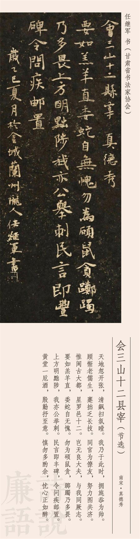 公元1232年,南宋官員真德秀到福州擔(dān)任知府,到任后把下轄12個(gè)縣的知縣召集在一起集體談話,擺事實(shí)、講道理,談廉政、申紀(jì)律,事后將談話內(nèi)容寫成了詩,就是今天我們看到的這首作品。這是一首五言敘事詩,長達(dá)250字,這里我們節(jié)選后半部分。