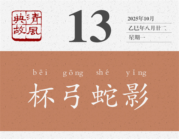 樂(lè)廣想,哪有這回事呢?當(dāng)時(shí),河南聽(tīng)事堂墻壁上掛著一張弓,上面用漆畫(huà)著一條蛇。樂(lè)廣就想,這位朋友所見(jiàn)杯中之蛇,是不是這張弓的影子呢?于是,復(fù)原了上次喝酒的現(xiàn)場(chǎng),讓客人坐在原來(lái)的位置上,將酒杯放在原來(lái)的地方上,問(wèn)他“酒中復(fù)有所見(jiàn)不”,客人說(shuō)“所見(jiàn)如初”。樂(lè)廣這才告訴他,杯中之蛇只是角弓之影而已??腿擞谑?ldquo;豁然意解,沉疴頓愈”。后世即以“杯弓蛇影”為典,比喻疑神疑鬼,自相驚擾。明人袁宏道詩(shī)《病中和黃道元至日禪寺夢(mèng)悉詩(shī)》:“消愁莫問(wèn)弓蛇影,對(duì)境聊觀夢(mèng)幻身。”