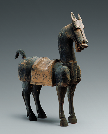 漢代,武威市磨嘴子漢墓出土。高87厘米,長72厘米。木馬形體高大,張嘴嘶鳴,四足直立,作佇立狀。通體涂黑,用刀刻出眼、鼻、唇,尾后舉下垂。馬鞍用白粉涂底,上以黑色勾畫出云氣紋。整體造型雄渾質樸,生動傳神。
