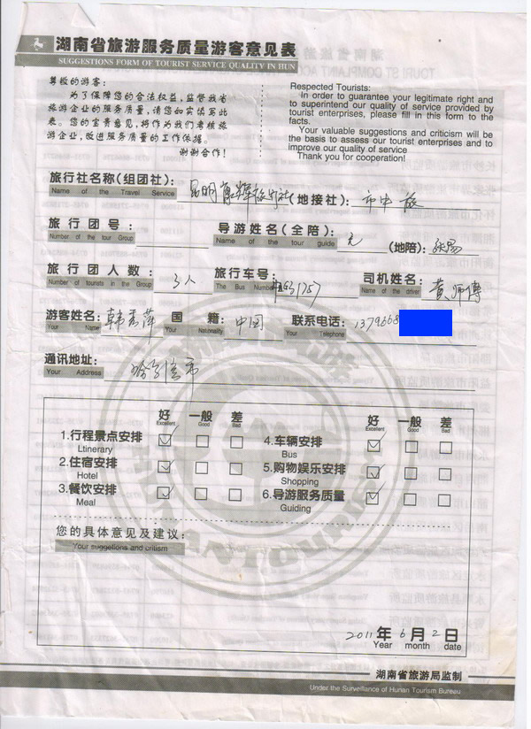 黑龍江哈爾濱韓小姐一行3人旅游質(zhì)量回饋:都很滿(mǎn)意!