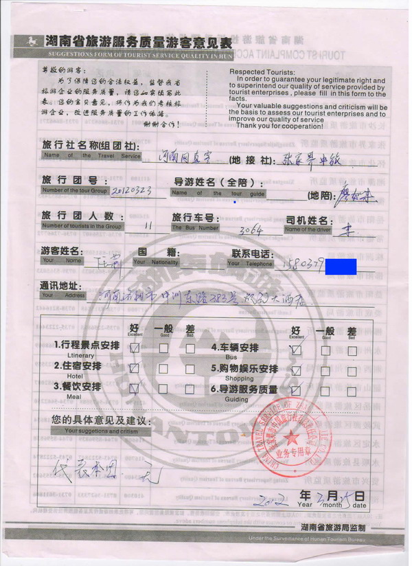 河南任小姐一行11人旅游質(zhì)量回饋