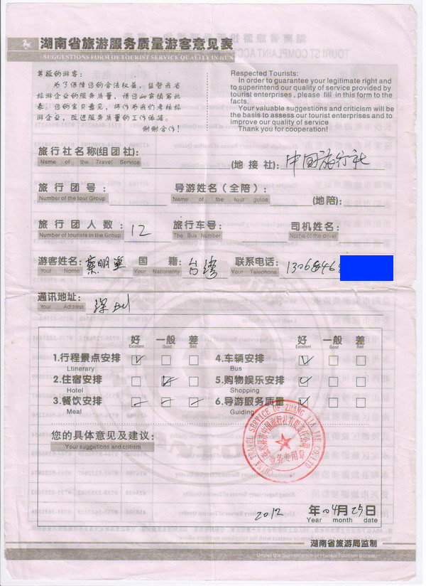 臺灣蔡先生一行12人旅游質(zhì)量回饋