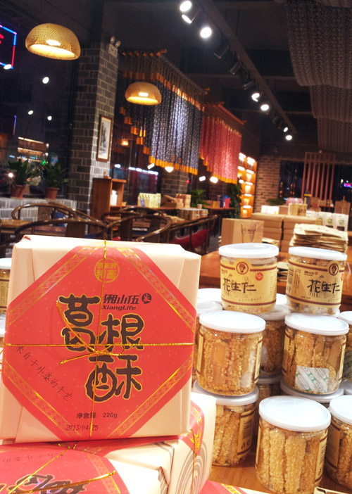 在我快遺忘這件事的時候,接到了小江的電話。小江說在張家界找了很多地方,才在湘小伍·家找到了我想要吃的葛根酥,也只有湘小伍·家才有這個產(chǎn)品。湘小伍·家除了有傳統(tǒng)的葛根粉,也有了新的產(chǎn)品——葛根全原粉,生產(chǎn)工藝是:山中挖掘——水洗表皮泥土——切片——烘干——將葛根片直接磨成300目的粉,此工藝保留了葛根的所有有用物質(zhì)和微量元素。因為相對來說淀粉的比例變少,沖制時,不會成很稠的糊狀。為保證所有微量元素的價值,建議用攝氏100度的開水涼至80度時沖飲,效果最佳,而且葛根原本的香味更濃。為更方便食用,湘小伍·家用葛根粉、葛根全原粉與面粉按4:6的配比,研發(fā)了“葛根酥”產(chǎn)品,用烘培的方法,采用傳統(tǒng)的包裝形式,不僅風(fēng)味獨特,而且民族特色鮮明,可算是最接地氣的張家界土特產(chǎn)品了,產(chǎn)品一上市,就得到了廣大市民和游客的認(rèn)同與喜愛,產(chǎn)品極其暢銷。我很快收到了小江寄來的快遞,打開快遞一看見包裝就讓我愈發(fā)的想家,小時候過年走親戚帶禮品的老式包裝,懷舊的感覺讓我想起很多回憶,再拆開來品嘗一番,外婆手藝的味道也在嘴里蔓延……