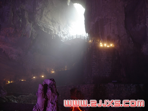 17個國家的20多名洞穴專家三次下九天洞考察,探出洞里面可供游覽的面積是250多萬平方米,分為上、中、下三個主體層次(我們現(xiàn)在 處在第一層,第二、三層還在下面)最低層低于地面470米,洞內(nèi)有三條陰河,十二條瀑布,十五個潭,二口龍井,五座自生橋,六塊千丘田,三個天然湖,五個池,十余座洞中山,三十六個大廳等等。目前這個洞僅開發(fā)了整個面積的十分之一,也就是說我們今天的游覽面積是25萬平方米左右,這其中,我們能看到四個天窗和六個大廳(其它五個天窗和大廳在尚未開發(fā)的地方),整個游程是8華里(4公里)路,兩個小時左右,請大家做好心理準(zhǔn)備。