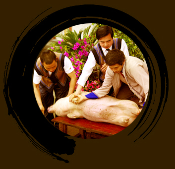 據(jù)說有道行或有經(jīng)驗(yàn)的屠夫,可以根據(jù)年豬的血狀來斷定來年主戶家的禍福吉兇、財(cái)運(yùn)年成等,如宰殺的年豬血很少或無血,則預(yù)示著主戶家來年的財(cái)運(yùn)差,甚至要破財(cái);如豬血噴射較遠(yuǎn)且成火焰狀,則預(yù)示著來年主戶家應(yīng)防火災(zāi)或血光之災(zāi);如豬血暢旺且很有規(guī)律,血色鮮艷且多,無異狀,則預(yù)示著來年主戶家財(cái)運(yùn)好,收成好無災(zāi)難。 另外,殺年豬時(shí)主戶家的主婦是不能到場(chǎng)壩看殺豬的,說是看了殺豬后來年就喂不好豬(稱為“不來豬”)。其主要原因可能是不忍心看宰殺年豬的場(chǎng)面,畢竟自己喂養(yǎng)的牲畜,朝夕相處,多少都有點(diǎn)感情罷了。 年豬殺死后,主戶家的婦女們就要端走豬血盆,灑上食鹽,讓其凝固,做成豬血豆腐。婦女們便忙著做飯燒菜,準(zhǔn)備招待接來吃“刨湯”的客人及屠夫,來吃“刨湯”的大多是女兒、女婿和摯友鄰居等;男人們就忙著刨毛清臟,屠夫則將年豬掛上釕環(huán)(專門掛豬肉的工具)后,把豬肉分成大小不等的肉塊,這時(shí)屠夫的工作就算完成了。將豬肉腌制上炕大多是婦女們的事,因?yàn)橛檬雏}腌肉打“紅鍋”有一套很繁雜的工序,腌制上炕后,經(jīng)過一段時(shí)間的煙熏烘烤便成了有名的“土家臘豬肉”了。最后就是吃飯喝酒,先把屠夫請(qǐng)到上席入座,再把吃“刨湯”的客人按輩分高低分別安排落座后,由主戶家男人(稱為當(dāng)家人)熱壺酌酒,婦女們就忙前跑后,端菜盛飯,熱情款待客人,客們則一邊吃喝,一邊聊家常,其樂融融。 |