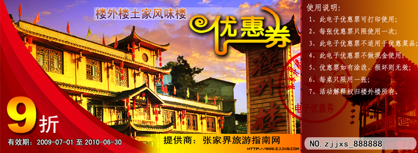 1、此電子優(yōu)惠劵(網(wǎng)絡(luò)版)由張家界樓外樓土家風(fēng)味樓聯(lián)合張家界旅游快車商務(wù)網(wǎng)聯(lián)合發(fā)行,真實(shí)有效; |