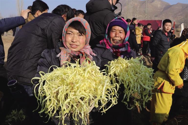 “今年地頭價(jià)每斤15元,這還是頭一回。”勞動(dòng)間隙,村民們議論著韭黃的價(jià)格,隨后把一筐筐金燦燦的韭黃放在商販的稱上,接著到手的便是一疊疊鈔票。“給韭黃抖土感覺就像數(shù)錢一樣,嘿嘿,麥草下的‘黃金’今年又豐收了。”村民們你一言我一語(yǔ),爽朗的笑聲回蕩在冬日的余暉里。