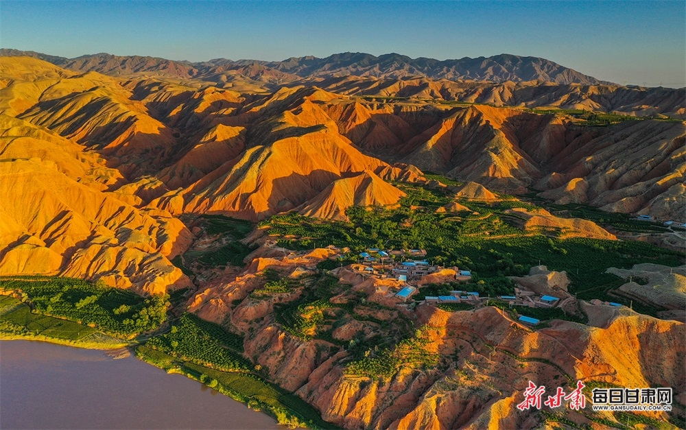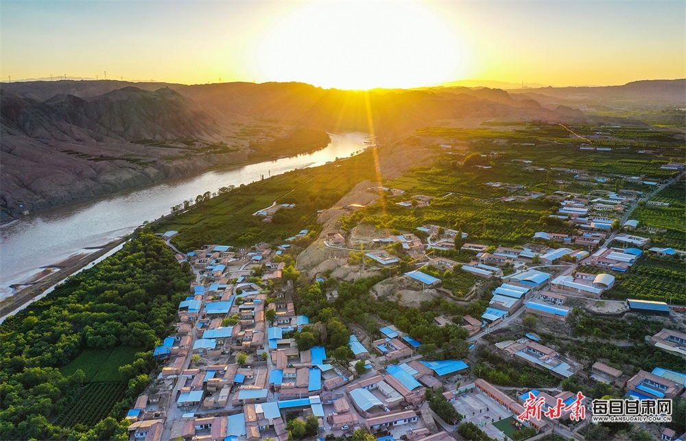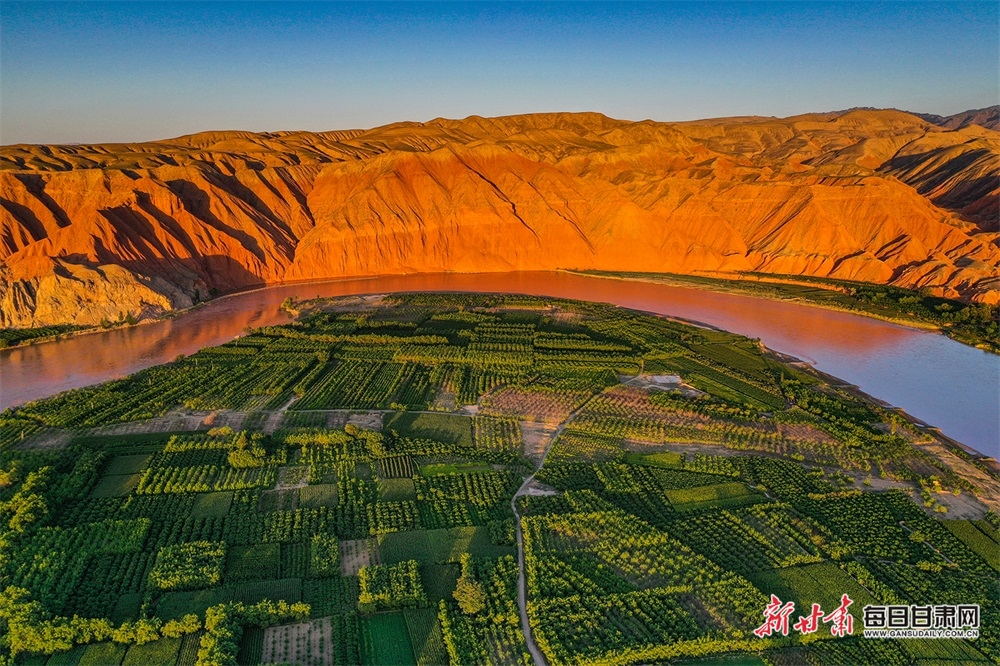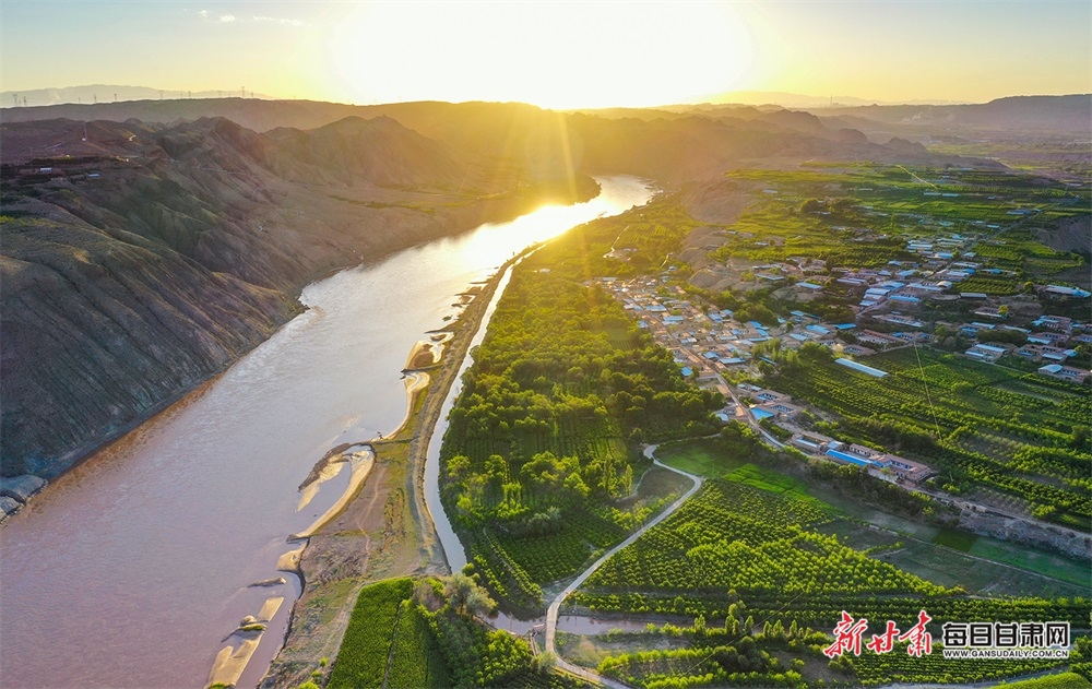 夏日,夕陽(yáng)西下,黃河在景泰五佛鄉(xiāng)境內(nèi)的車木峽繞了個(gè)大大的彎,位于黃河峽谷中的 車木峽山村高山環(huán)繞,周圍是成片的樹(shù)林,廣袤的田野閃耀著瑰麗的色彩,靜靜地躺在綠色的懷抱之中。
