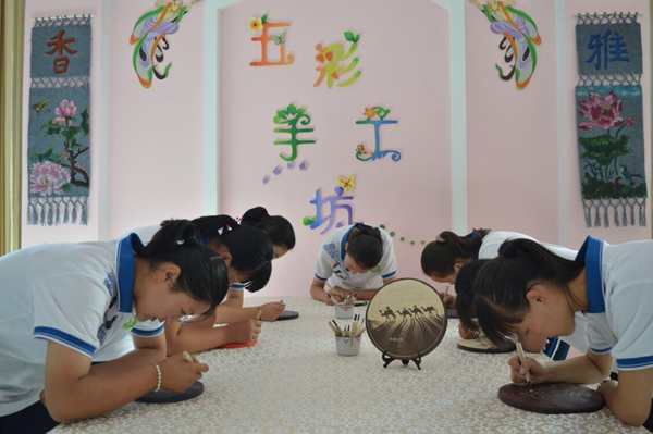 敦煌市黃渠中學(xué)學(xué)生學(xué)習(xí)木板雕刻畫。敦煌市委宣傳部供圖
