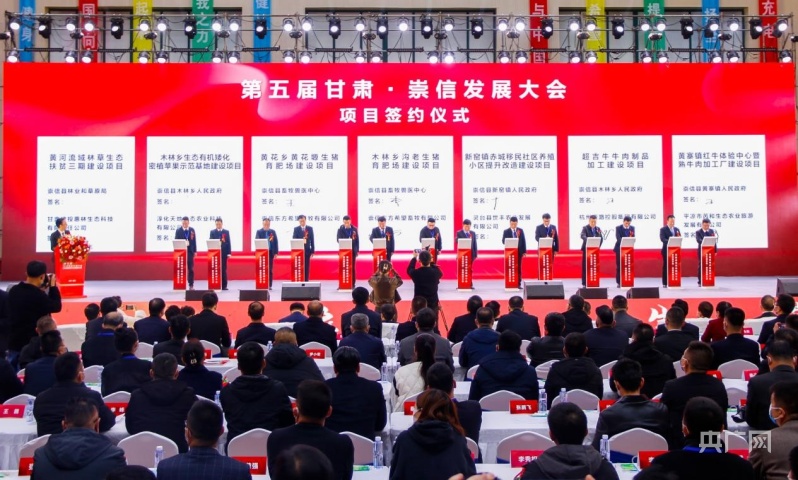 央廣網(wǎng)蘭州3月19日消息(記者邸文炯)3月19日,第五屆甘肅·崇信發(fā)展大會(huì)暨強(qiáng)縣域行動(dòng)招商大會(huì)在甘肅省平?jīng)鍪谐缧趴h舉辦,大會(huì)共簽約項(xiàng)目49項(xiàng)、簽約金額103.39億元,項(xiàng)目涵蓋煤炭清潔高效利用、綠色建材、平?jīng)黾t牛、生豬、優(yōu)質(zhì)蘋果、設(shè)施蔬菜、文旅康養(yǎng)、生態(tài)環(huán)保等。