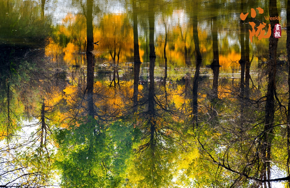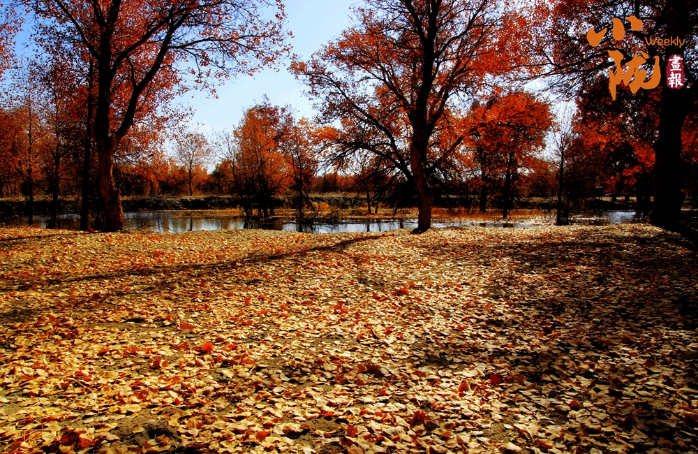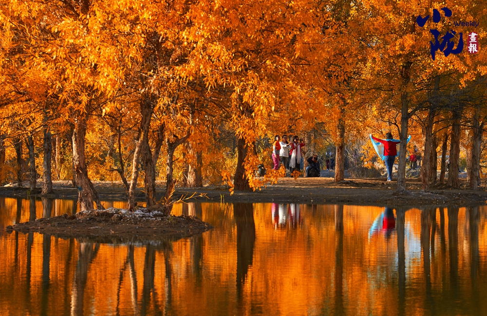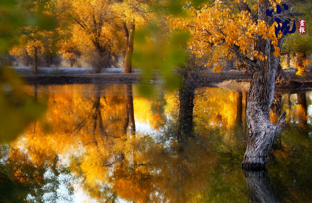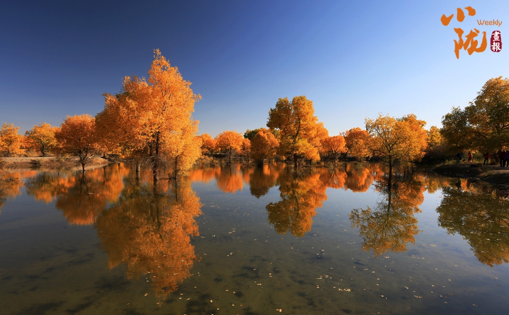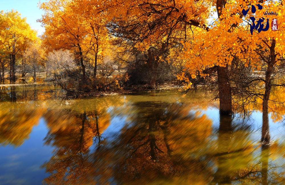 湛藍(lán)的天空、清澈的湖水、倒影的胡楊、金色的落葉,斑斕得如同油畫(huà)色彩。