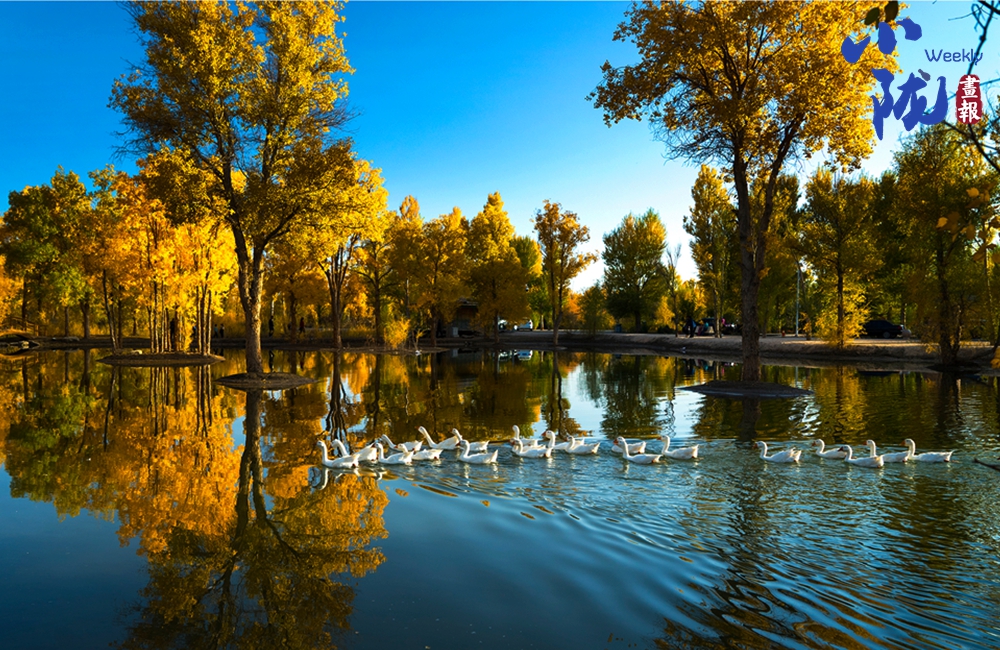 金色的胡楊倒映在蔚藍(lán)的水中,白鵝嬉戲,構(gòu)成了一幅幅色彩對(duì)比強(qiáng)烈、視覺(jué)沖擊力極強(qiáng)的絕美畫(huà)面。