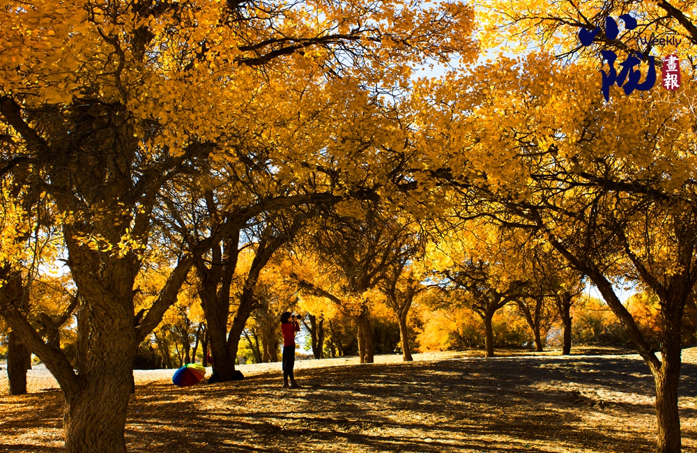 一排排胡楊高大挺拔、蔥蔥蘢蘢,一棵棵樹(shù)冠如同一把把巨傘,遮天蔽日、枝繁葉茂,絢爛得仿佛一片金色的海洋。