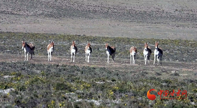 畫面顯示,此次拍攝到藏野驢共10頭,它們覓食歸來,時而排成一排,悠閑地看著眼前的陌生來客,時而奔跑,馳騁在廣袤的草原之上。