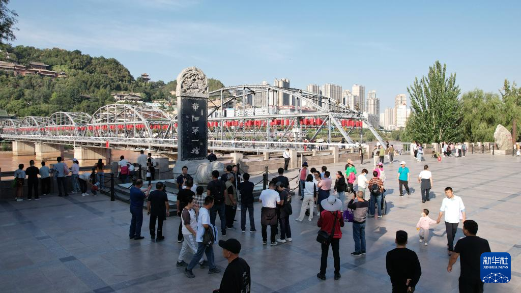 游客在蘭州地標(biāo)——中山橋參觀游覽(9月23日攝,無人機(jī)照片)。新華社記者陳斌攝