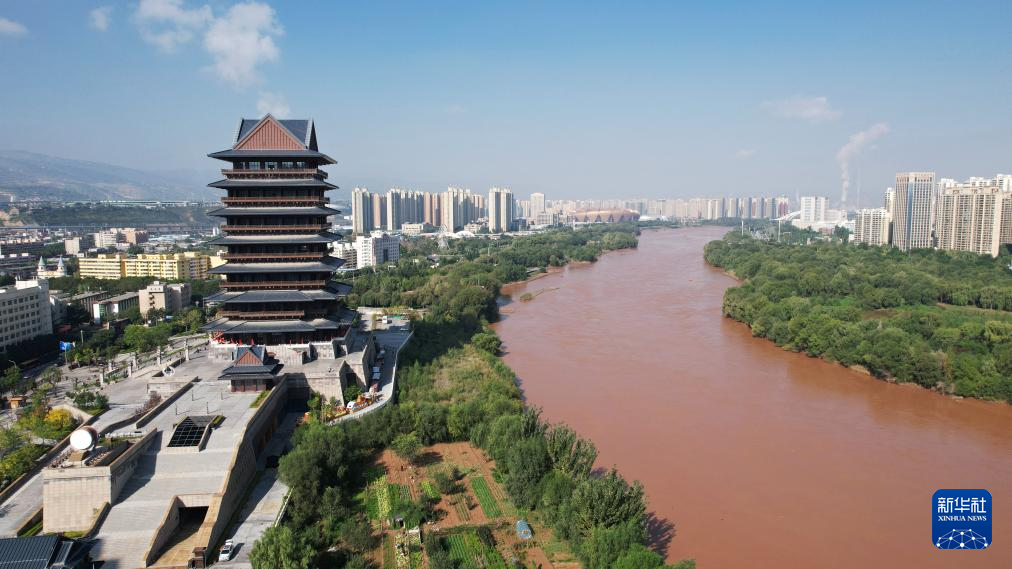 這是位于黃河蘭州段南岸的黃河樓(9月26日攝,無人機(jī)照片)。新華社記者陳斌攝