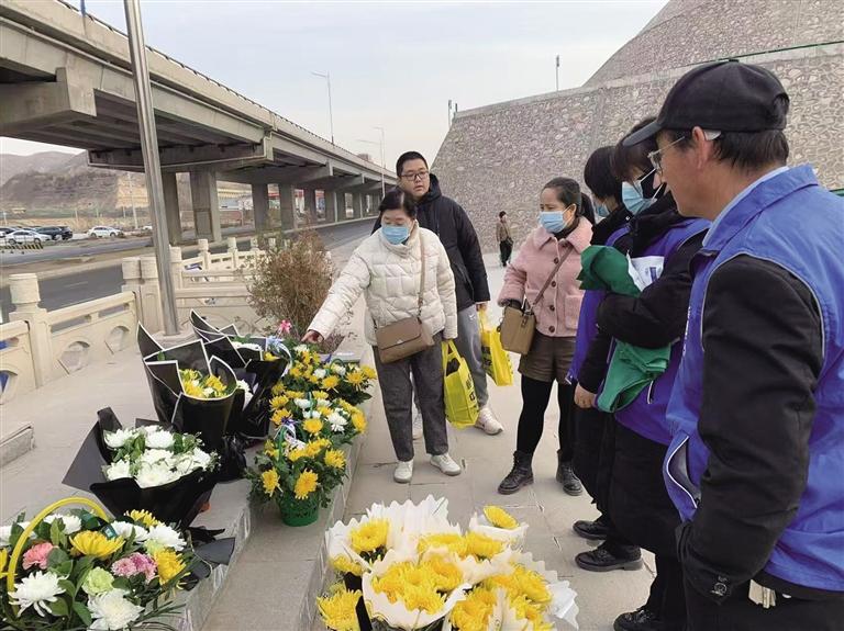 市民在墓區(qū)門外購買鮮花