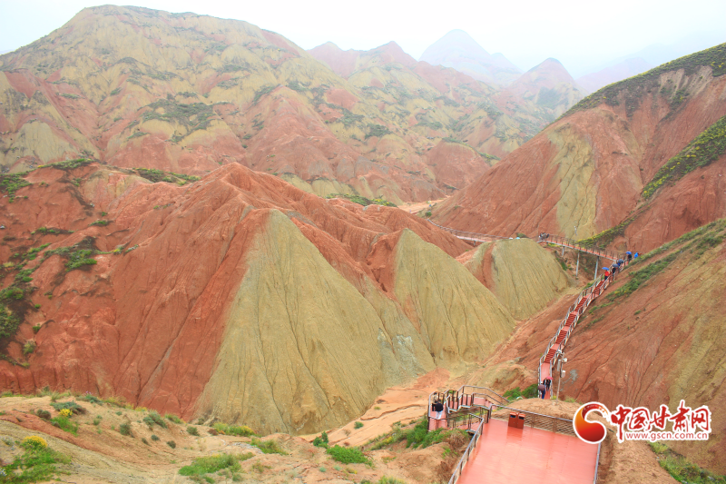 游客們乘坐觀光車沿途游覽,絲路霞光、九色丹青、丹頂攬勝等7個(gè)觀景平臺(tái)各具特色,山體色彩斑斕、紋理交錯(cuò),雨后更如水墨畫(huà)般淡雅別致,與北宋《千里江山圖》、元代《富春山居圖》的意境神似。