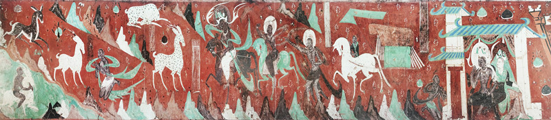 這幅壁畫在藝術(shù)風格上獨樹一幟,深受中原繪畫形式的影響。它既摒棄了印度壁畫的環(huán)形構(gòu)圖方式,又不同于龜茲壁畫里的菱形畫面布局,而是開創(chuàng)性地采用了連環(huán)畫式的長卷式構(gòu)圖,宛如一條歷史的長河,將故事娓娓道來。