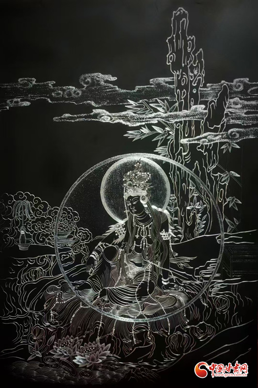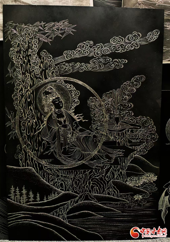 對(duì)張兆武來說,做鍥金畫從來不是“照貓畫虎”。他琢磨傳統(tǒng)書畫的筆墨、篆刻的力道,慢慢攢出了自己的一套刀法;創(chuàng)作時(shí),心里裝的也全是敦煌——從莫高窟第112窟里“反彈琵琶”的靈動(dòng)舞姿,到傳說中“九色神鹿”的溫潤(rùn)模樣,都成了他刻刀下的主角。他刻出的飛天,飄帶像帶著風(fēng);刻出的菩薩,眉眼間透著莊重;金屬的光澤在畫面上流轉(zhuǎn),明明是靜態(tài)的畫,卻像在講一段活的敦煌故事。“不用多說什么,看過的人能懂這份美。”張兆武說的這份“懂”,恰恰打破了文化和語言的距離,讓東方的古老美學(xué),和全世界的現(xiàn)代審美碰出了共鳴。