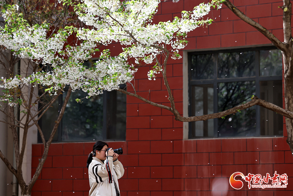 4月6日,攝影愛(ài)好者在甘肅蘭州大學(xué)校園內(nèi)拍攝櫻花。