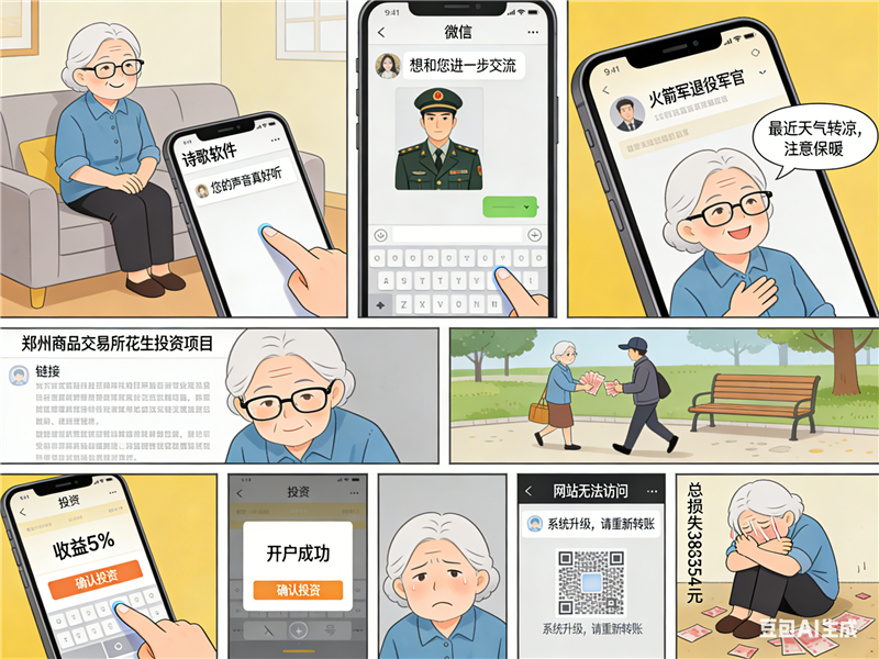 警方拆解該案騙術(shù)發(fā)現(xiàn),騙子共分七步將紀奶奶從“詩友”變成“提款機”。第一步,潛入詩歌朗誦這類中老年人聚集的興趣社群,精準篩選目標;第二步,以“聲音好聽”為切入點,通過情感鋪墊營造“黃昏戀”錯覺,建立情感依賴;第三步,多次切換聊天軟件,躲避平臺反詐監(jiān)測;第四步,偽裝“火箭軍”身份,利用老一輩對軍人的天然信任感,以國家信譽背書;第五步,讓老人幫忙操作虛假賬戶,親眼見證“穩(wěn)賺5%”的假象;第六步,邀請老人自己投資,誘導(dǎo)其向個人銀行卡轉(zhuǎn)賬;第七步,要求線下現(xiàn)金交易,繞過銀行風控,增加資金追回難度。