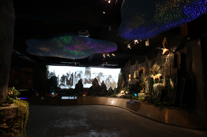 展廳右側(cè)為一幅張家界全景水墨長(zhǎng)卷,以多媒體投影的云霧輔助全景畫的形式為游客描繪了一幅奇峰競(jìng)秀、奇花爭(zhēng)妍、云煙繚繞、溪水潺潺、珍禽競(jìng)翔、鳥啼蟬鳴的張家界。畫里的山石自然延伸到了畫外,一些珍禽異獸的標(biāo)本從巖石的縫隙中探出身來(lái),在燈光的襯托下既靈動(dòng)、神秘又切合主題。