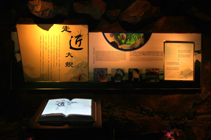 從影視廳出來(lái),步入大鯢文化展區(qū),展區(qū)入口處為一幅竹簡(jiǎn)長(zhǎng)卷,長(zhǎng)卷呈現(xiàn)了《西澤補(bǔ)遺》里所記載的《鯢志》全文。長(zhǎng)卷斜對(duì)面的展區(qū)以雕塑的形式詮釋了《鯢志》中送子魚的典故。與雕塑相接的是光雕形式的《鯢考》,呈現(xiàn)了戰(zhàn)國(guó)以來(lái)有關(guān)大鯢的古代文獻(xiàn),揭示了中國(guó)古代大鯢的分布、用途以及人工養(yǎng)殖的歷史。整個(gè)展區(qū)的右側(cè)為一太極書案,幾卷攤開的竹簡(jiǎn)從案頭下垂到案基,竹簡(jiǎn)上篆刻了大鯢與道家思想淵源的文字,考證了太極拓?fù)洵h(huán)取形于大鯢外形的淵源。書案背后的墻上開了幾扇土家族的花格窗,透過花格窗看到的是一則則道家故事的插圖。書案左手邊為一排美人靠,背景投影湖南鳳凰古城的風(fēng)貌的動(dòng)態(tài)視屏。書案右手邊為金屬珠簾,起到隔斷空間作用,透而不通。整個(gè)展區(qū),意在揭示大鯢與道家思想的淵源。