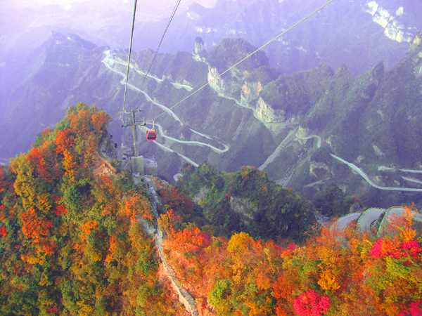 順勢而上,可見幾座遠峰迎面而來,外形如根根箭桿,共有九座相連,傳說是后羿射日的九根箭桿所化而成.美麗的傳說和神奇的景觀,融匯成了天門山的雄偉,奇俊和妖嬈,充盈著整條通天大道的旅程,最終讓人感受到的則是天門山的慧然靈氣!