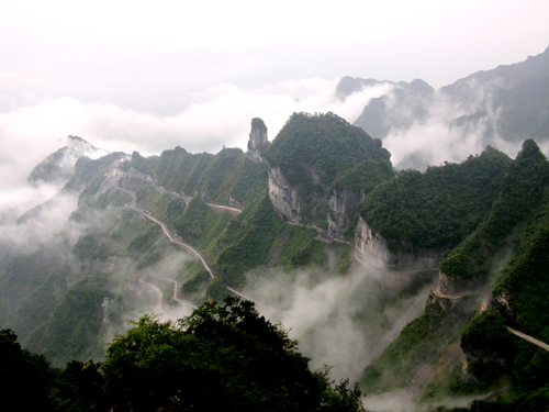 通天大道以進山時的標志門為起點,一直通達天門洞腳下,全長 10.77 公里 ,但就在這么短的距離里,它的海拔卻從 200 米 急劇提升到了 1300 米 ,大道兩側(cè)絕壁千仞,空谷幽深, 180 度的急彎此消而彼長,層層疊起,“ 堪稱天下第一公路奇觀 ”.中國書法協(xié)會常務(wù)副會長沈鵬先生走過通天大道后欣然為其題字“曲道通天”,字體遒勁挺拔,與通天大道的奇絕天下相融為一體.