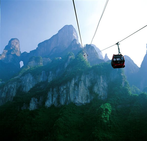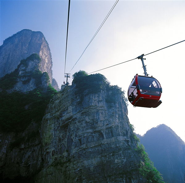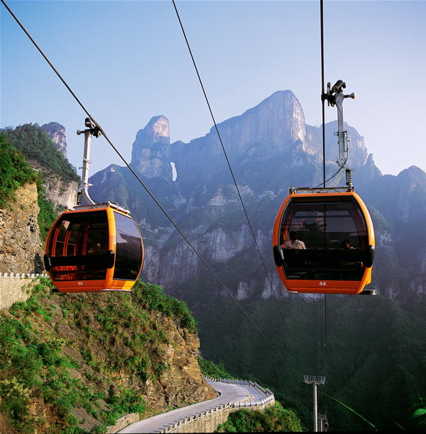 天門山索道線路斜長 7455 米 ,它以張家界市中心的城市花園為起點,直達天門山頂?shù)脑伎罩谢▓@,猶如一道彩虹飛渡“人間” “ 天上 ” ,又象一條巨龍騰翔 素云蒼穹,依山籍壁,拔地沖天,恢宏壯觀。 天門山索道自 2003 年元月 15 日開工至 2004 年底竣工,總投資 2.26 億元人民幣。由于索道沿線山體高絕奇險,地質(zhì)地貌復(fù)雜多變,設(shè)計和施工難度遠遠超乎一般,整個建設(shè)過程艱辛無比。天門山索道不僅凝結(jié)了中外參建人員的智慧和汗水,也融合了當(dāng)代索道工程最先進的科技成果,堪稱當(dāng)代索道工程建設(shè)中的一個奇跡,一個里程碑。 天門山索道綜合了世界上最尖端的客運索道技術(shù),索道共有 57 個支架,其中含 3 個水平救護支架,支架由國內(nèi)生產(chǎn),主要設(shè)備均由法國波瑪公司供應(yīng),索道鋼繩來自于法國, 98 個吊廂來自瑞士 CWA 公司,單個造價高達 20 萬元人民幣。。索道的 運載索 張緊系統(tǒng)采用液壓張緊方式,設(shè)一個中間驅(qū)動站,是世界上最長的單線循環(huán)脫掛抱索器車廂式索道。轎廂體高 2 米 ,單個造價高達 20 萬元人民幣。索道鋼繩為 6 × 36WS 型,直徑 50.5 毫米 ,每米重達 10 公斤 ,索距 6.2 米 ,索道運行速度為每秒 6 米 ,按順時針方向運行,每兩個吊廂的間距為 172.8 米 ,時間間隔為 28.8 秒,單向運量為每小時 1000 人,最大爬坡角 38.6 度,這在世界均屬罕見。 天門山索道最大的亮點就是它的爬坡面支架的設(shè)計 ,這個支架共有壓索輪 96 個,托索輪 16 個,它綜合了現(xiàn)代物理學(xué)、現(xiàn)代工程學(xué)、現(xiàn)代制造業(yè)中最先進的理論和成果,應(yīng)用了世界最先進的索道技術(shù),從而使這段索道總給人一種蕩氣回腸、氣勢沖天的感覺。 同時為應(yīng)對臨時發(fā)生的特殊情況,天門山索道設(shè)計了 “ 水平救護 ” 和 “ 垂直,用于索道突然處于全面癱瘓時將游客安全救護至地面,這是目前世界上索道中的一套最完備最先進的救護系統(tǒng)。并為確保特殊天候下的安全,索道站房都安裝了防雷電設(shè)備。