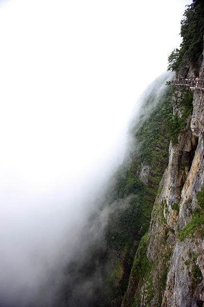 游覽通天大道,令人感受最深的也許就是一個“驚”字.驚“通天大道”蜿延峻巡于群山絕壁之上的絕險,驚“通天大道”艱苦建筑于壁立萬傾之中的奇?zhèn)?驚“通天大道”玉帶飄揚于寰宇蒼穹之間的人類創(chuàng)造史的奇跡.