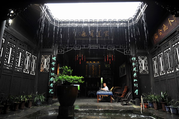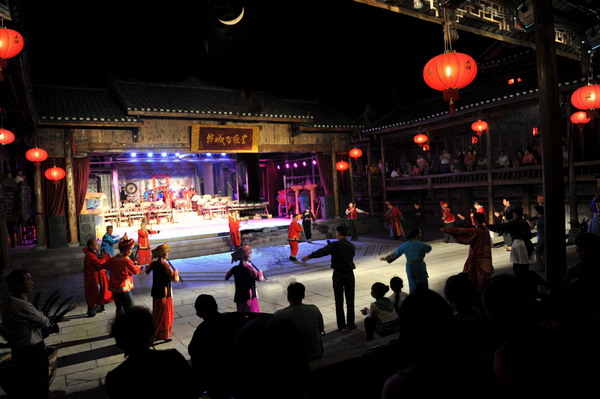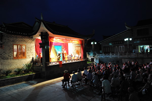 沒走幾步,一支帶著童音的歌聲,從一座木板庭院里傳出,幽雅,張揚,我們循聲走進這棟老屋,庭院里居然是一處表演場,一個小姑娘握著話筒在舞臺上一邊歌唱,一邊表演。這邊觀眾臺前端莊地坐著幾位帶有藝術氣質的中年人,他們在細語,像是在評判著那個姑娘的姿態(tài)和演唱。