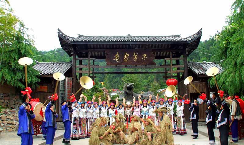 在張家界264平方公里石英砂巖絕壁頂上、3103根神秘山峰之巔至今唯一保存著一座土家山寨----袁家寨子。這里居住著一群喝虎乳長大的土家后裔,他們至今還沿襲200年前的后產(chǎn)、生活方式。這座寨子構(gòu)建獨(dú)特,是按照動(dòng)物形體建造的仿生建筑。寨民靠耕種“空中田園”為計(jì),為游人現(xiàn)場表演碾、榨、磨、碓、織等原始傳統(tǒng)手藝;通過唱、跳、哭、咒、符等另類的習(xí)俗和神秘的信仰,演繹著高山土著民的“人、神、情”秘訣。