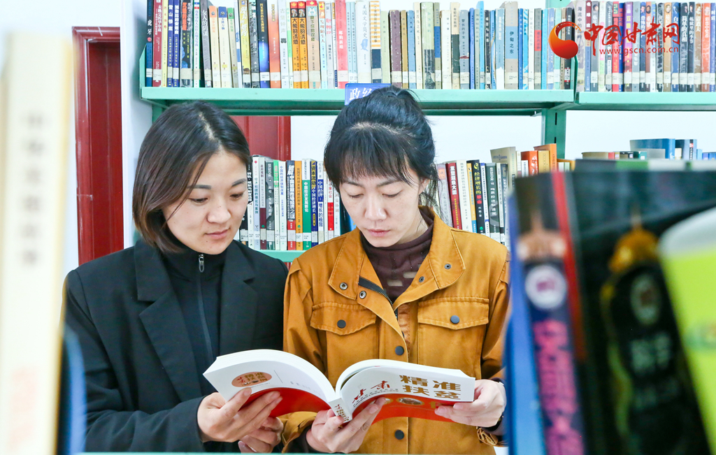 4月21日,甘肅張掖甘州區(qū)三閘鎮(zhèn)農(nóng)家書屋內(nèi)鄉(xiāng)村干部在挑選自己喜愛的書籍。