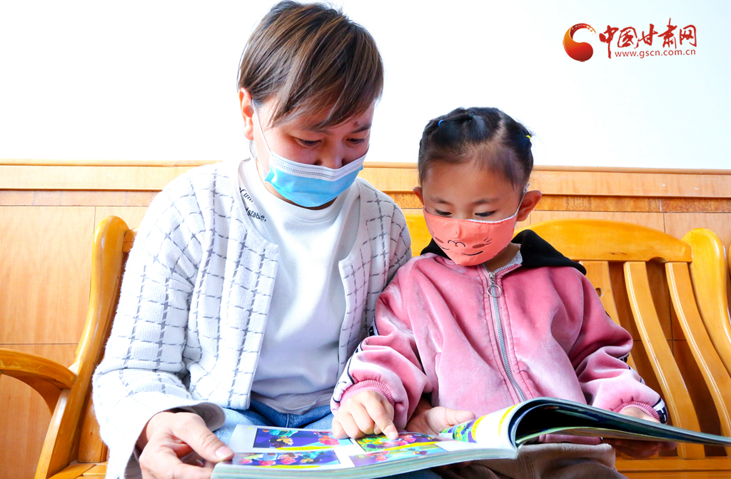 4月21日,甘肅張掖甘州區(qū)火車站街道下安村農(nóng)家書屋內(nèi)一名家長帶著孩子看書。
