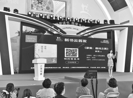 2020上海書展首次啟用了新書“云首發(fā)”的形式。8月15日,在《蒙曼:唐詩之美》新書“云首發(fā)”現(xiàn)場,讀者可以掃描大屏幕上的二維碼進行圖書購買。