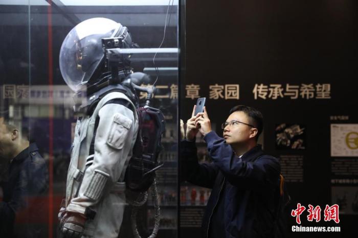 資料圖:展出的電影《流浪地球》中的服裝道具“地表防護(hù)服”吸引觀眾。中新社記者 蔣啟明 攝