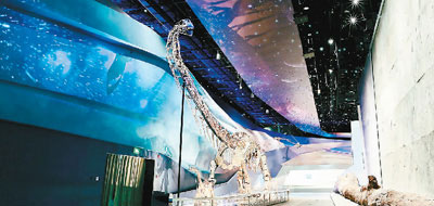 武漢自然博物館展示的中加馬門溪龍化石、硅化木和“龍”足跡化石墻。  本文圖片均由長江文明館(武漢自然博物館)提供