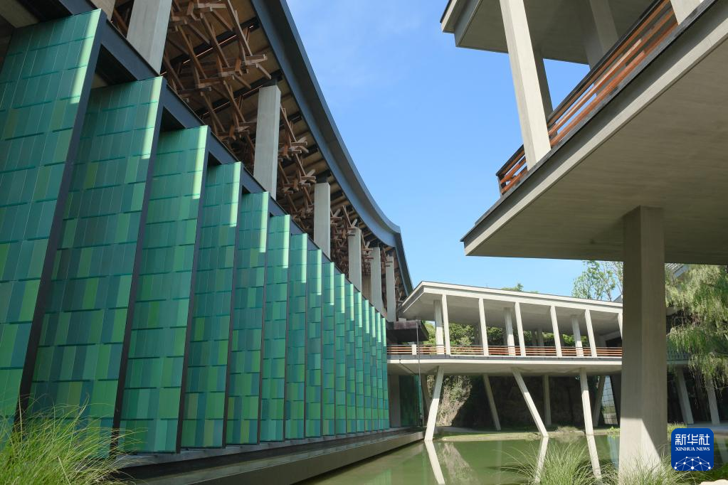 杭州國家版本館屋頂?shù)哪緲?gòu)和青瓷門扇相映成趣(7月23日攝)。